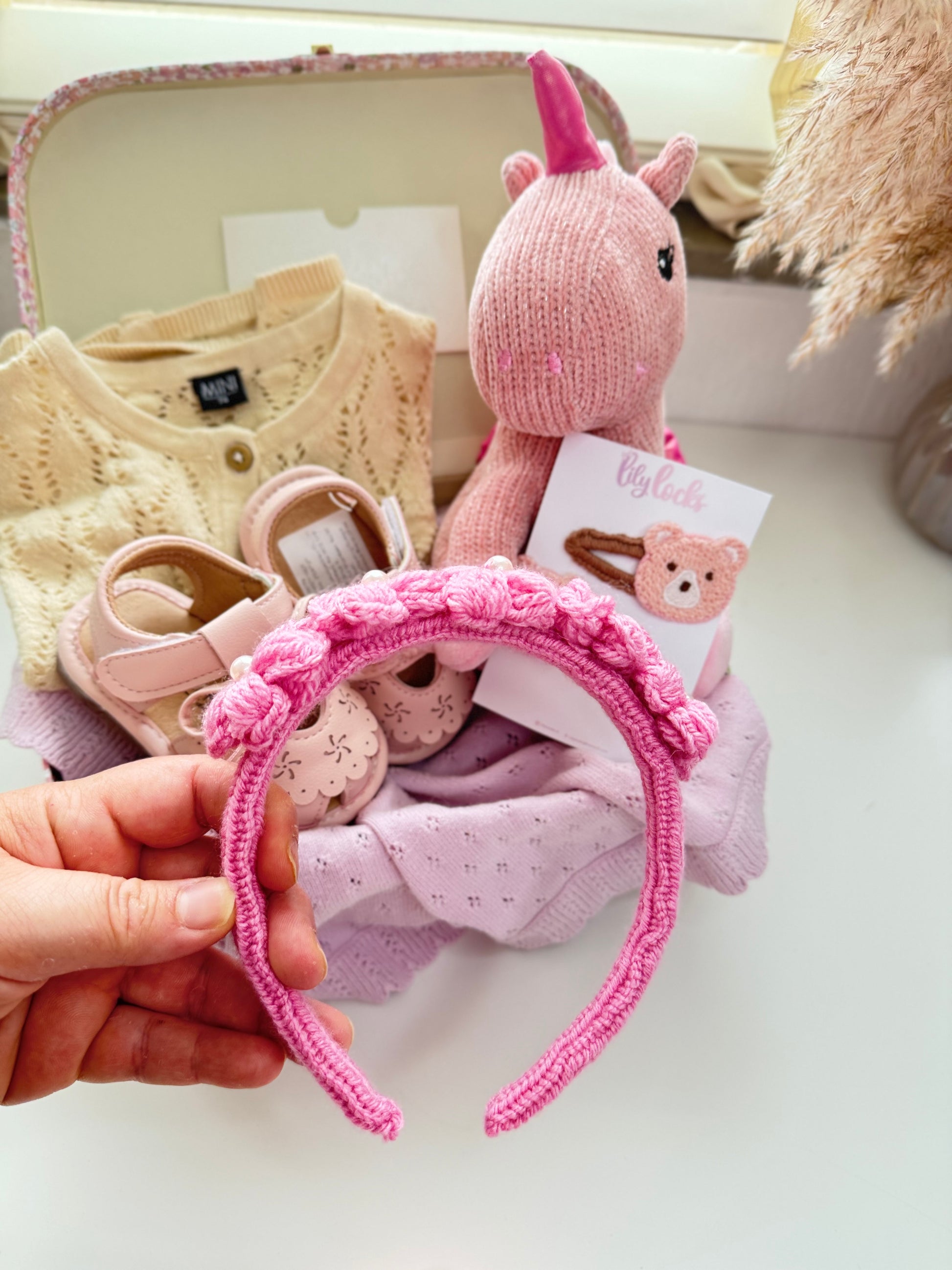 Onze Lily Bloom diadeem is een dromerig accessoire voor peuters en jonge kinderen. Elk exemplaar is met de hand gehaakt en versierd met zachte bloemen, afgewerkt met een pareltje of goudkleurig kraaltje in het hart. De diadeem is gemaakt van licht en flexibel plastic en is comfortabel om te dragen, ook tijdens lange speeldagen.