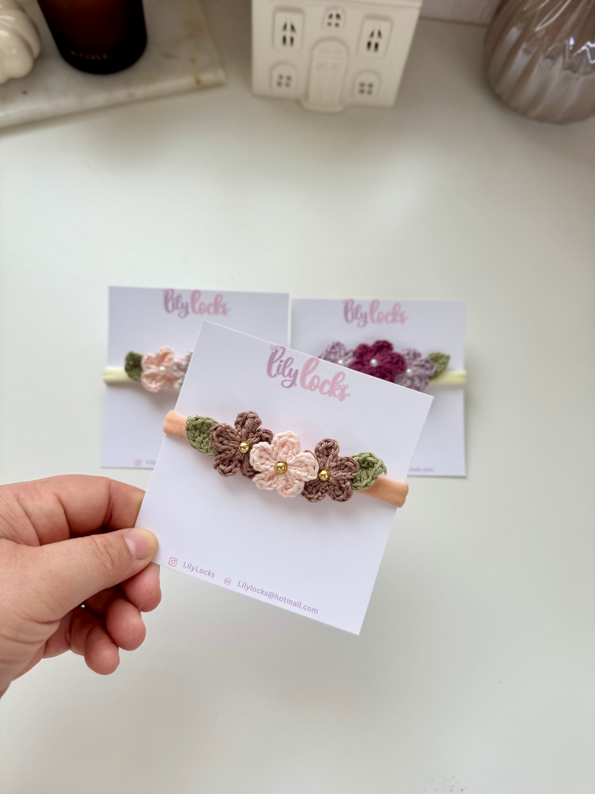 Onze handgemaakte *Lily Bloom* haarbandjes zijn de perfecte mix van zachtheid, comfort en stijl. Elk bandje is met liefde gehaakt en afgewerkt met drie fijne bloemetjes en blaadjes – een subtiel detail dat elke outfit nét dat beetje extra geeft. Dankzij het superzachte, rekbare nylon bandje zitten ze heerlijk bij zowel pasgeborenen als peuters.